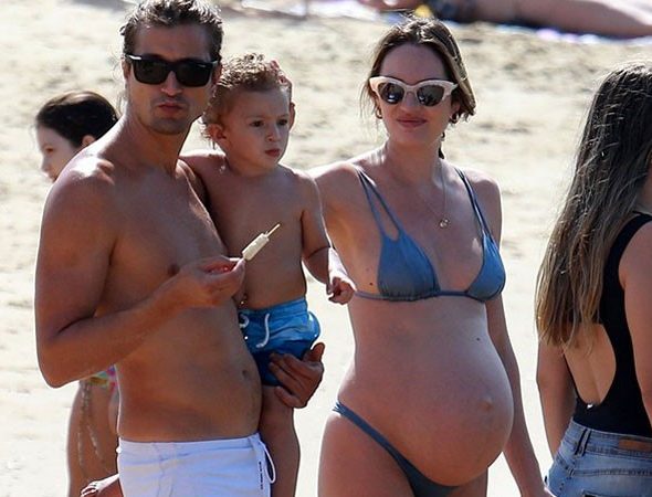 Grávida, Candice Swanepoel curte praia brasileira com marido e filho